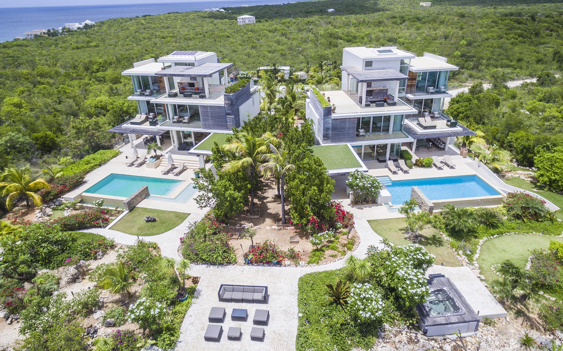 ÀNI Anguilla sleeps a total of 20 people. The north villa accommodates 8 people across 4 bedrooms whilst the south villa sleeps 12 people across 6 bedrooms. The estate is available to book on a 6, 8 or 10 suite basis and you can choose rooms within either or both of the villas during your stay. All 10 suites are required to be booked during the peak and festive seasons.