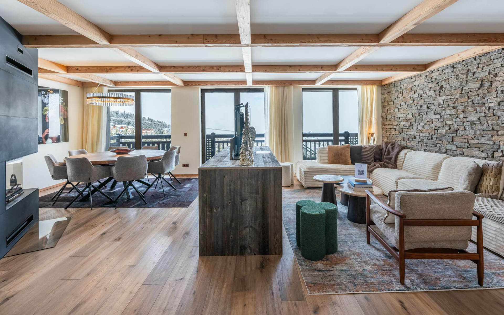 The heart of the apartment is the cosy living space, with neutral, Alpine decor, a roaring fire in one corner and a TV area for you to relax in after a day packed with adventure on the mountain. Nearby is a well-equipped kitchen with all you need to cater for your party, and a sophisticated dining space that’s the perfect backdrop for relaxed meals with friends.