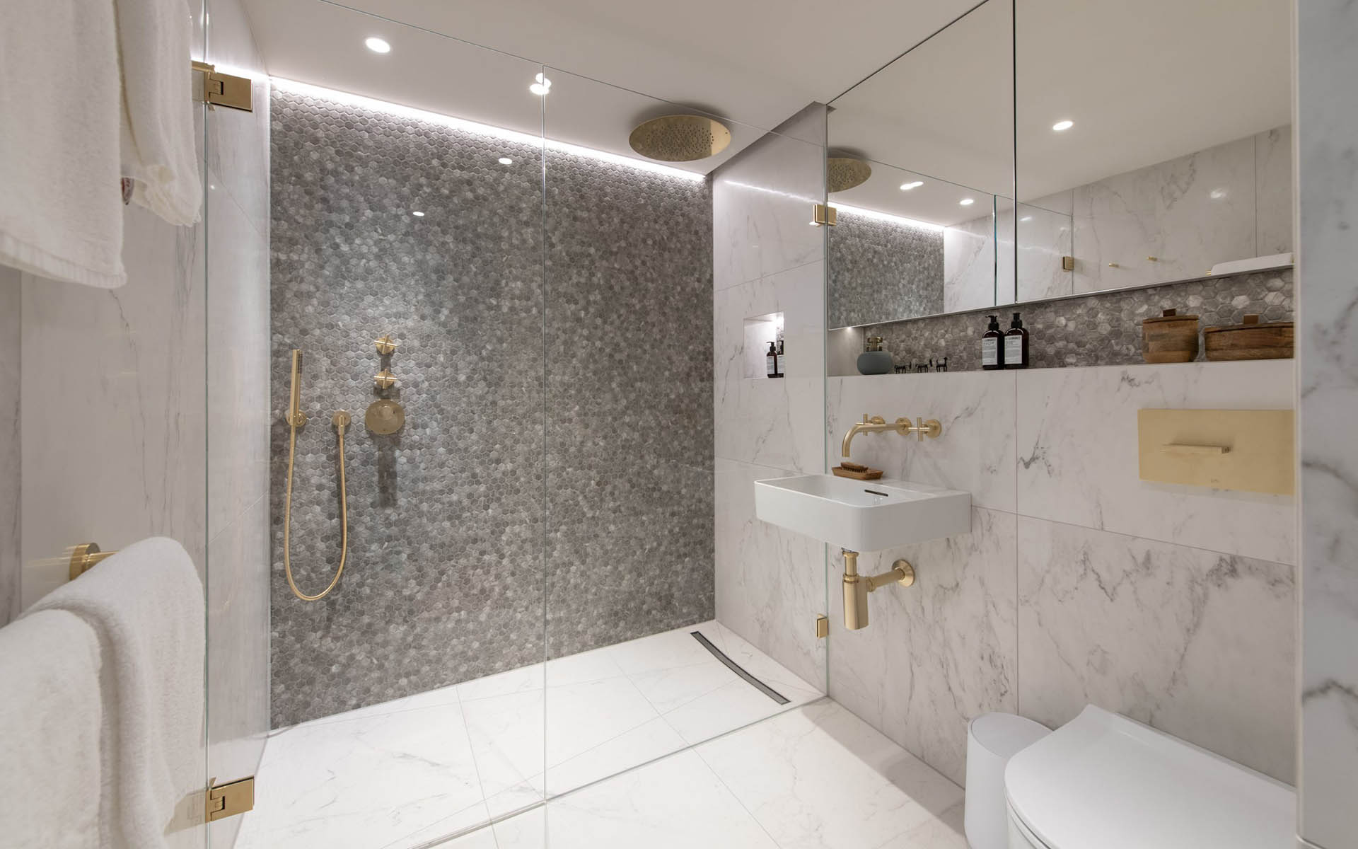 At the other end is the modern dining area, a comfortable space in which you’ll enjoy leisurely dinners long into the evening, illuminated by stylish pendulant lamps. Overlooking the dining area is the sleek, fully-fitted kitchen. Whether you want to enjoy meals in the privacy of your apartment or get out and about each evening, flexibility is a cornerstone of the property.
