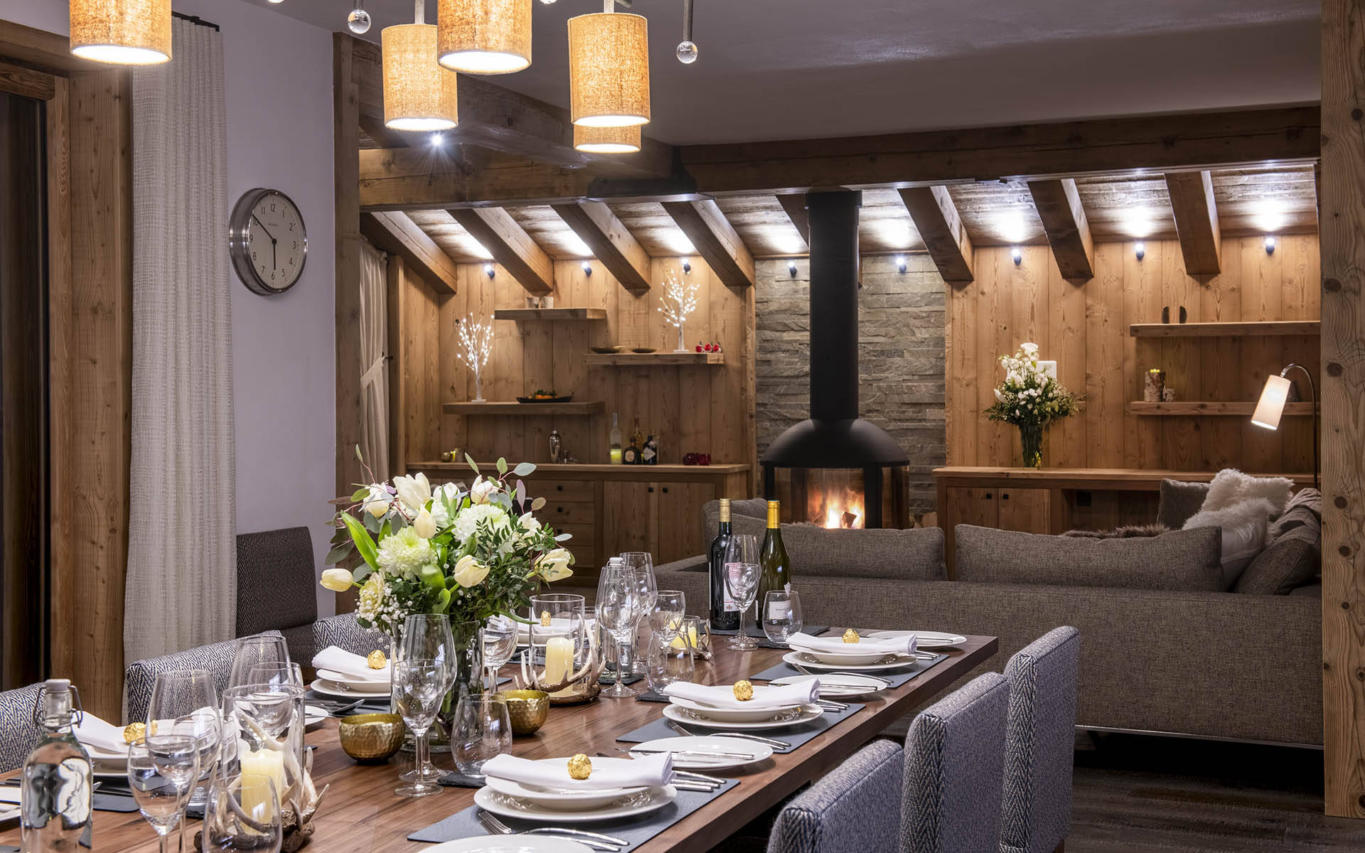 On the upper floor is the open-plan living space, flooded with light from the floor-to-ceiling windows overlooking the piste. At one end is the modern refectory-style dining table, the perfect place to sit and enjoy a morning coffee over breakfast as you all plan your day.