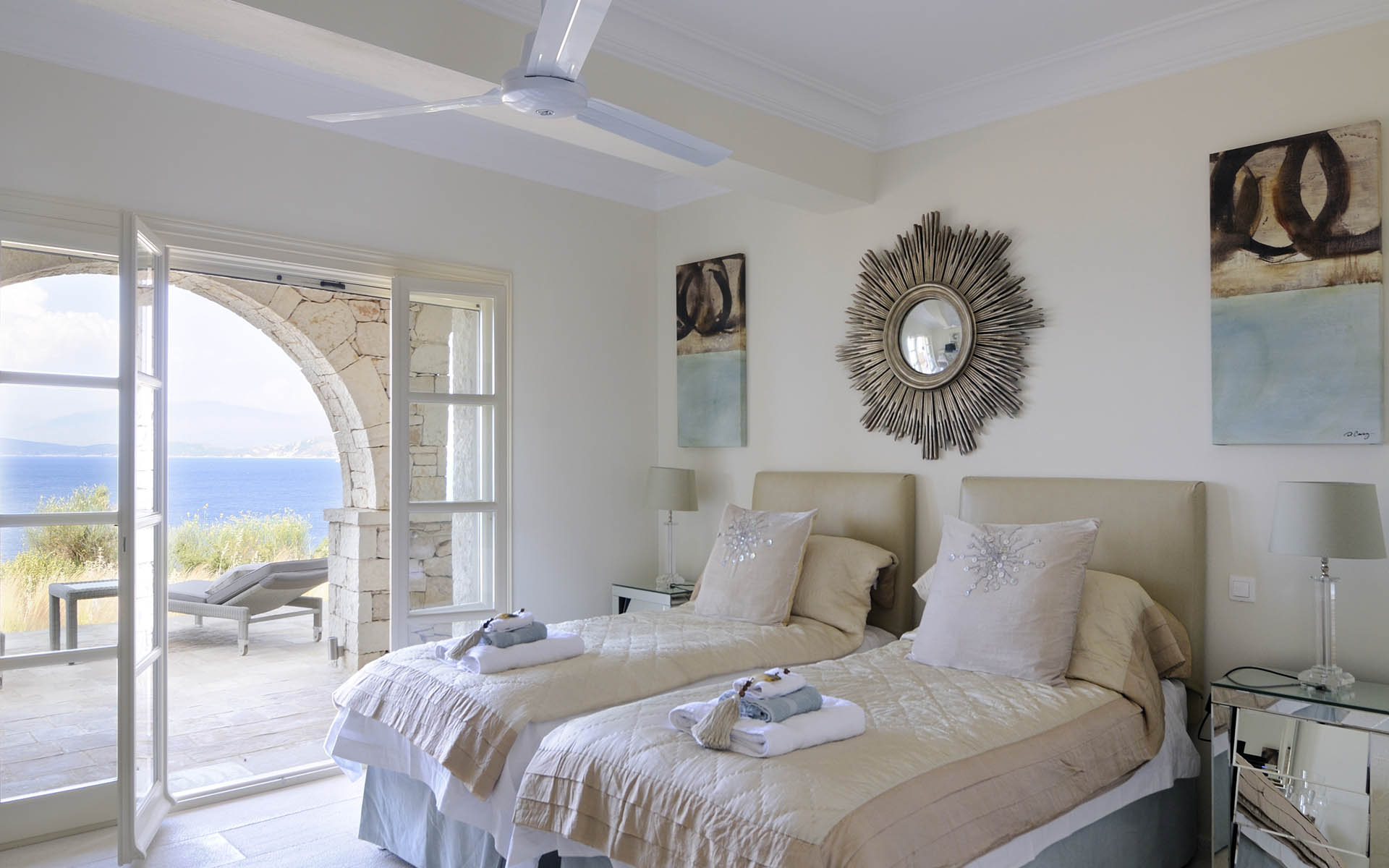 The sun-baked Greek island setting, the lavishly spacious house in its own grounds. So far, so idyllic. Cassiopeia House is the largest of two luxury villas sitting amidst olive groves and elegant cypresses on the private headland of the Kassiopia Estate. Their contemporary, elegant style was created by a Norman Foster-trained architect and was influenced by Venetian architecture blended with Corfiot features.