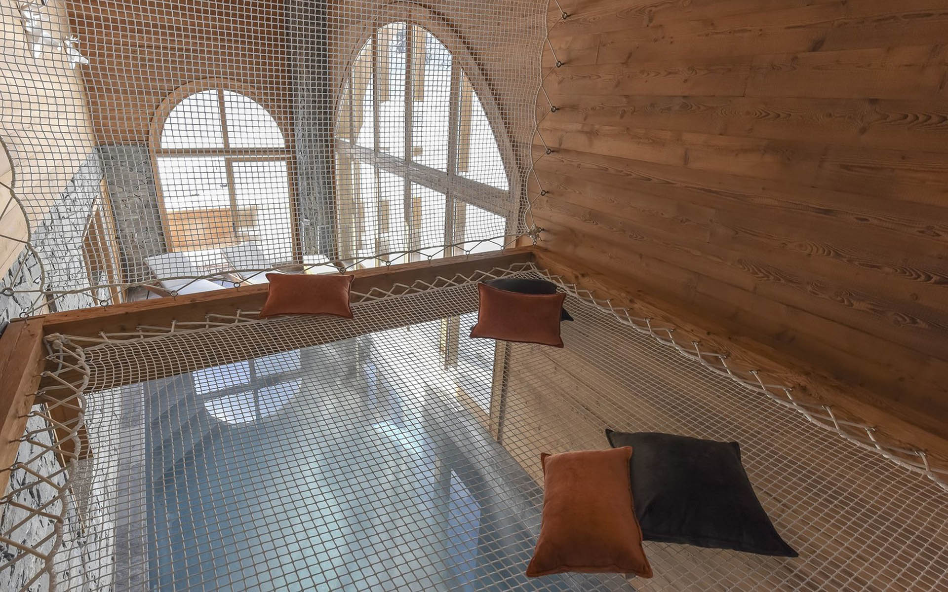 No luxury ski chalet would be complete these days without a swimming pool and at Chalet Alya you won’t be disappointed. The 7m x 3m pool is accompanied with a beautifully crafted stone wall on one side and a cracking two storey arched window on the other, bringing the outside in and vice versa. An über cool feature lies above the steamy waters. Hanging off the mezzanine level lies a suspended bungee cage. Adorned with comfy cushions, it offers a splendid spot to while away the hours armed with a glass of bubbly whilst the kids play in the pool below.