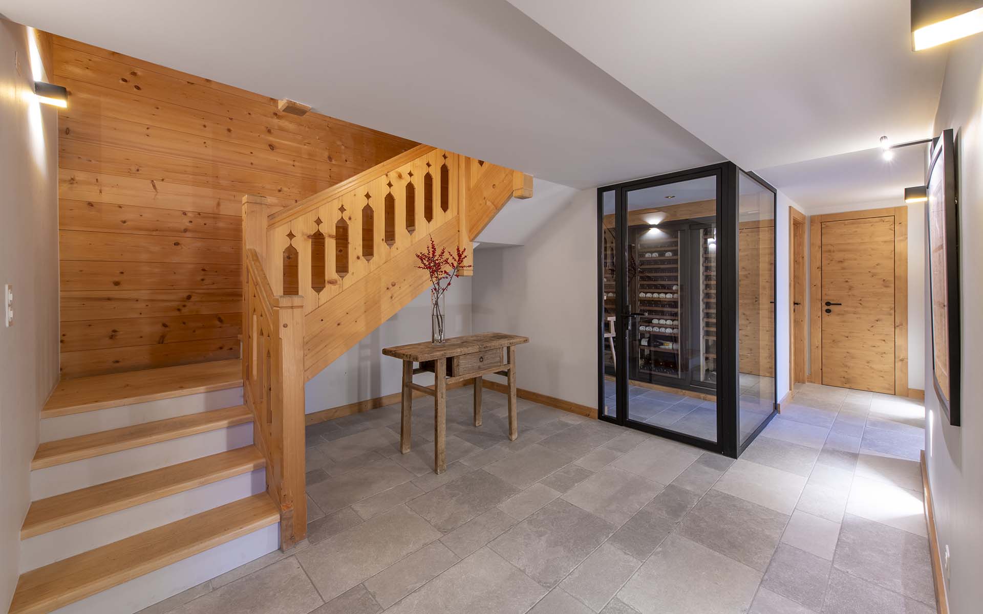 Huge, squashy sofas make the living area a wonderful place to relax, read the papers, and catch up on all your friends’ adventures at the end of each day. And there are plenty of little nooks to find a quiet moment in too, from the TV snug to the chess table, to the library where you can escape for an hour or two with a book. A south-facing balcony leads off the living area, with amazing views down to the valley. Take a blanket and a glass of wine out with you to truly appreciate it at its best! Chalet Bavaria even has its very own wine cellar, with bar, where you can enjoy wine tastings and getting to know some of the local labels.