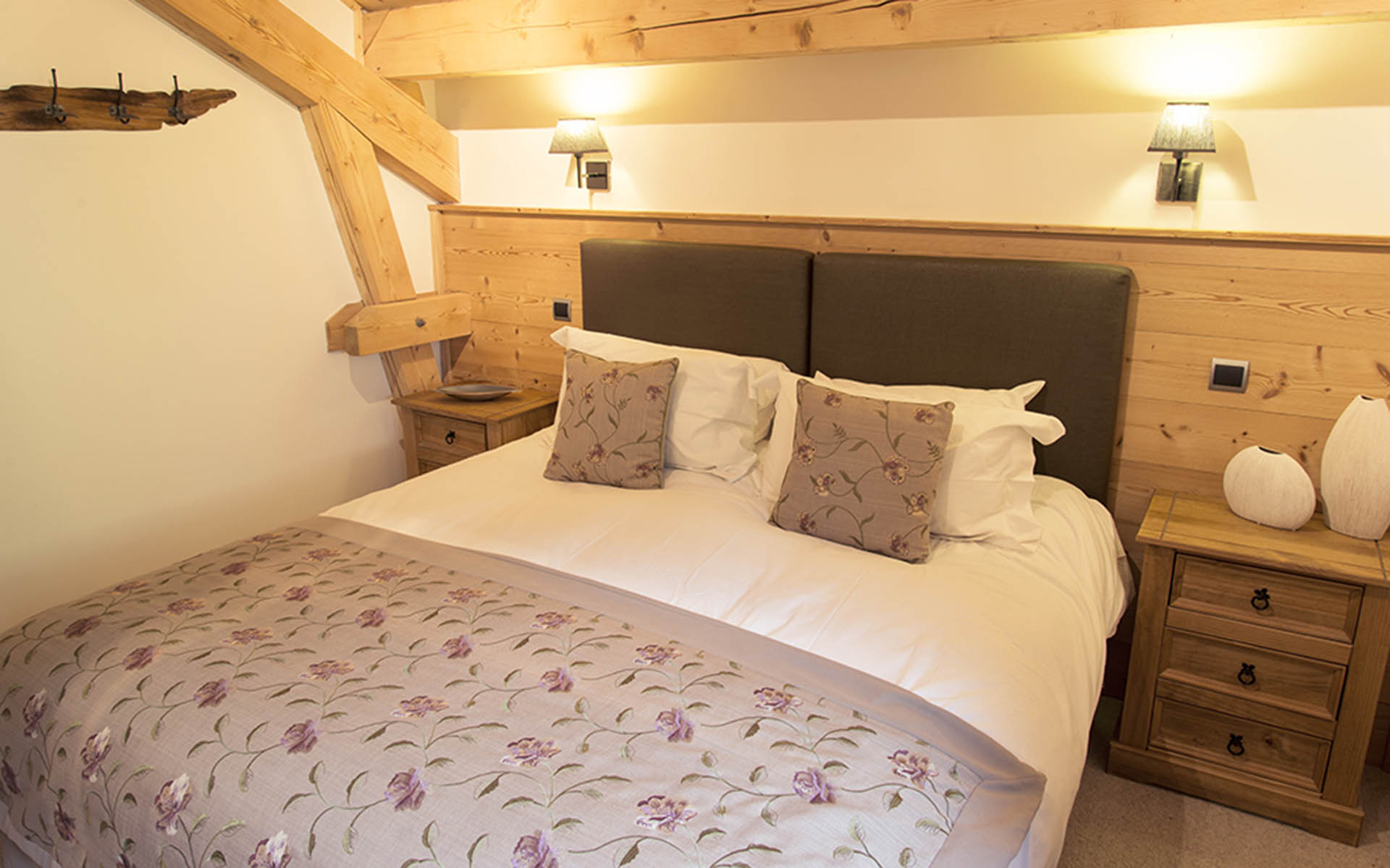 You’ll feel yourself relax as soon as you walk through the door. Inside, a neutral palette of colours brings a laid-back, cosy feel. Natural materials, such as the wood panelling, beamed ceilings and oak flooring add warmth, while cow hide rugs and soft leather sofas in the living area bring a bit of Alpine style. The open-plan living spaces make this a really sociable property to share with friends. Close by is a well-equipped kitchen area that any foodies among you will enjoy cooking in enormously. A small bar area provides somewhere to sit with a glass of wine and chat to whoever is playing chef for the evening. The cosy dining space has a rustic, refectory-style table with benches, just made for enjoying long, leisurely meals.
