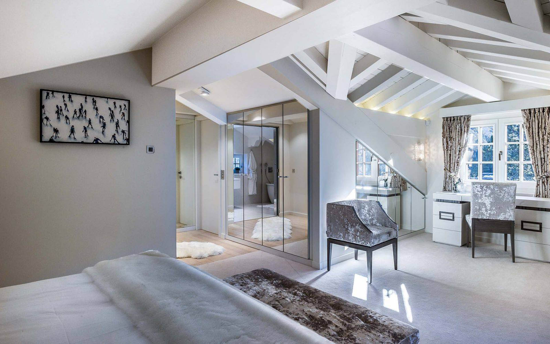 Outside, the property is pure Hansel and Gretel, while the modern interior is decorated in a palette of winter whites and silvery greys, with heavily textured crushed velvet and faux-fur accessories bring a feeling of comfort and warmth. It’s the perfect winter wonderland retreat.