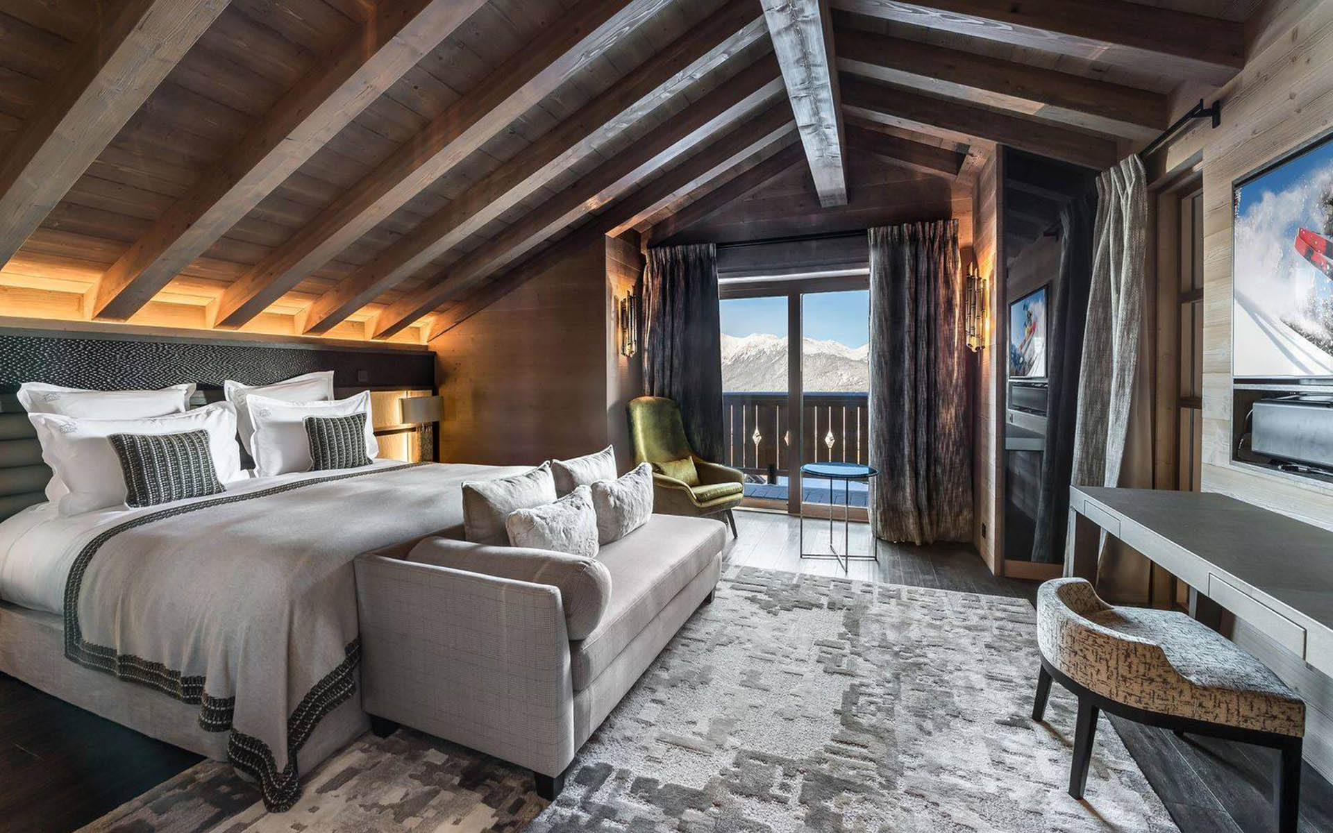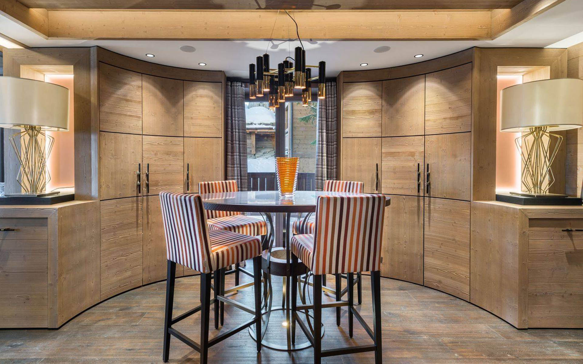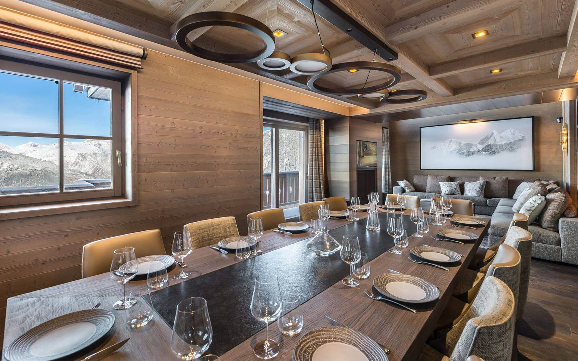 Right at the top of Chalet Elixir, with fabulous views, are the cosy and intimate living spaces. Capacious sofas and seats are gathered around the wood fire, which is kept laid ready to be lit as soon as you have kicked of your skis and made your way up in the lift for hot drinks and pastries at the end of your skiing day. A pretty dining area is in the window seat, giving you a wonderful outlook as your chef prepares your breakfast and dinner each day.