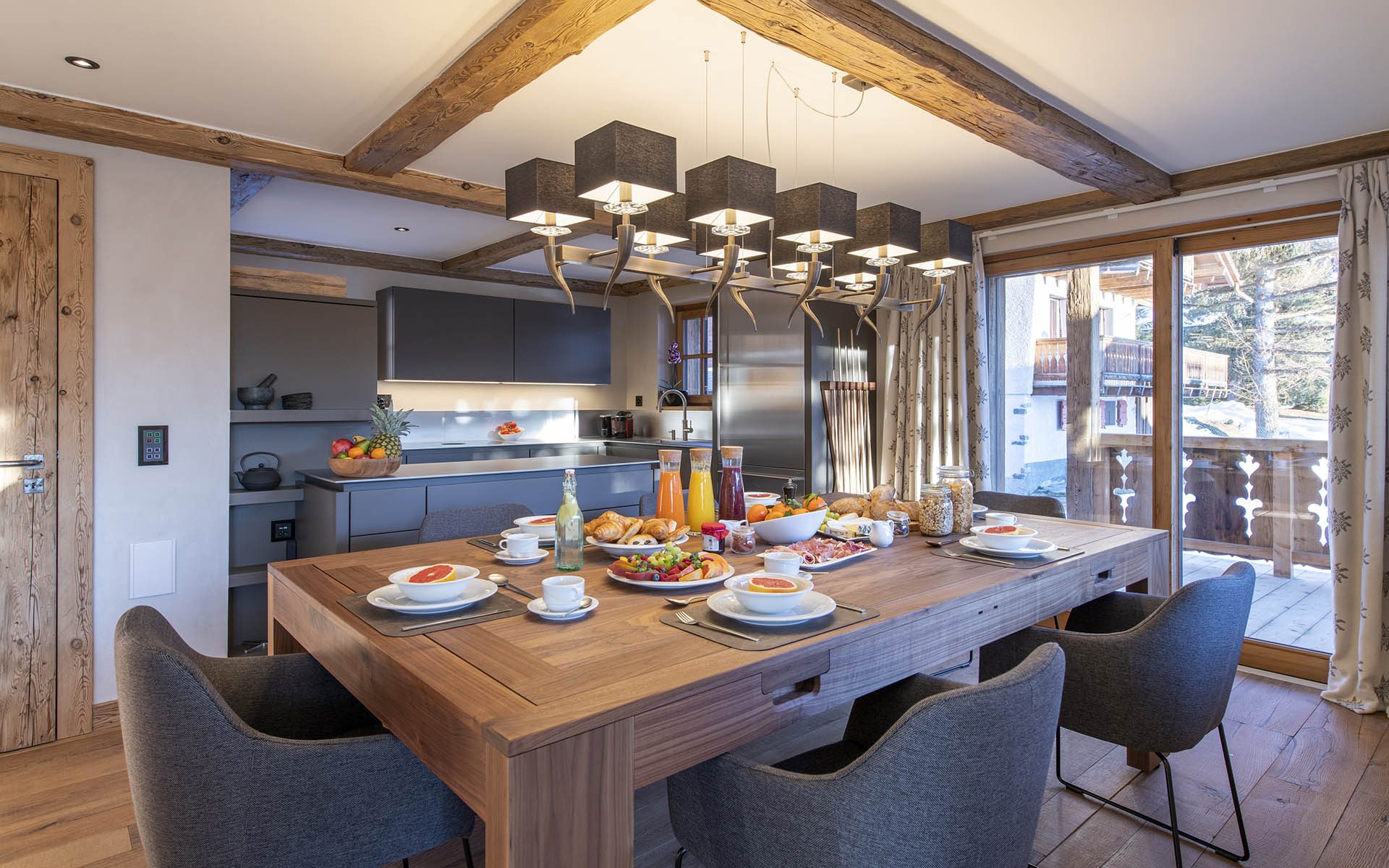 At the other end is the modern dining area, a dreamy space in which you’ll enjoy long, leisurely dinners. The sleek, open-plan kitchen is very well appointed with everything you need should you wish to cater for your party in the comfort of your chalet.