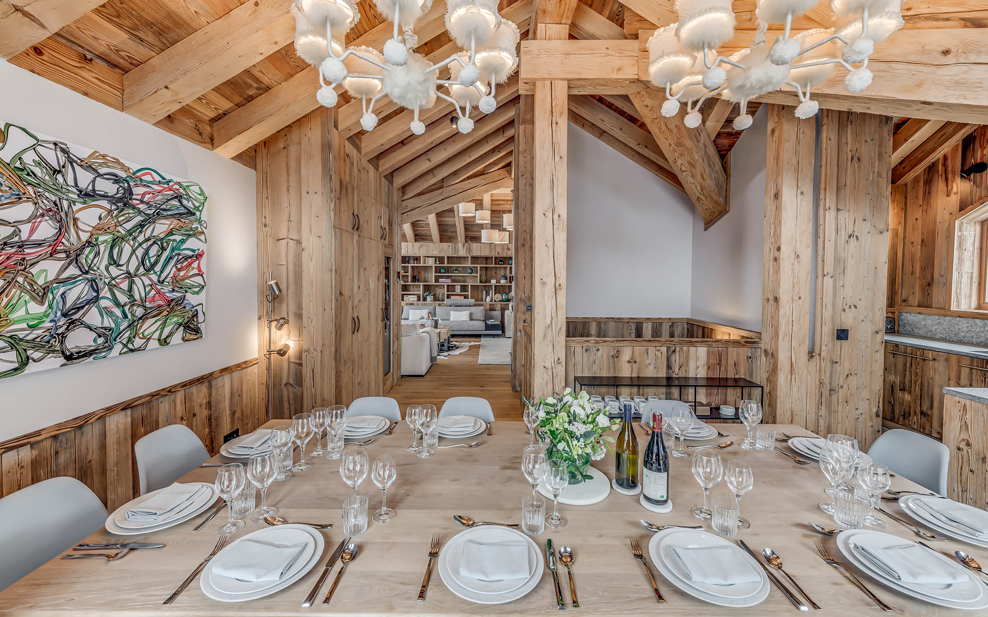 In the cosy living space, huge windows frame the mountain views, and a roaring fire and comfy sofas makes you feel instantly cosy; the perfect spot to gather with friends for good wine, good conversation, maybe even a game of chess! Throughout the communal spaces, statement lighting and modern art bring contemporary character to the traditional Alpine style. The modern dining area is a great space in which to enjoy family meals prepared by your welcoming host and feels beautifully cosy in the evenings under the twinkling lights.