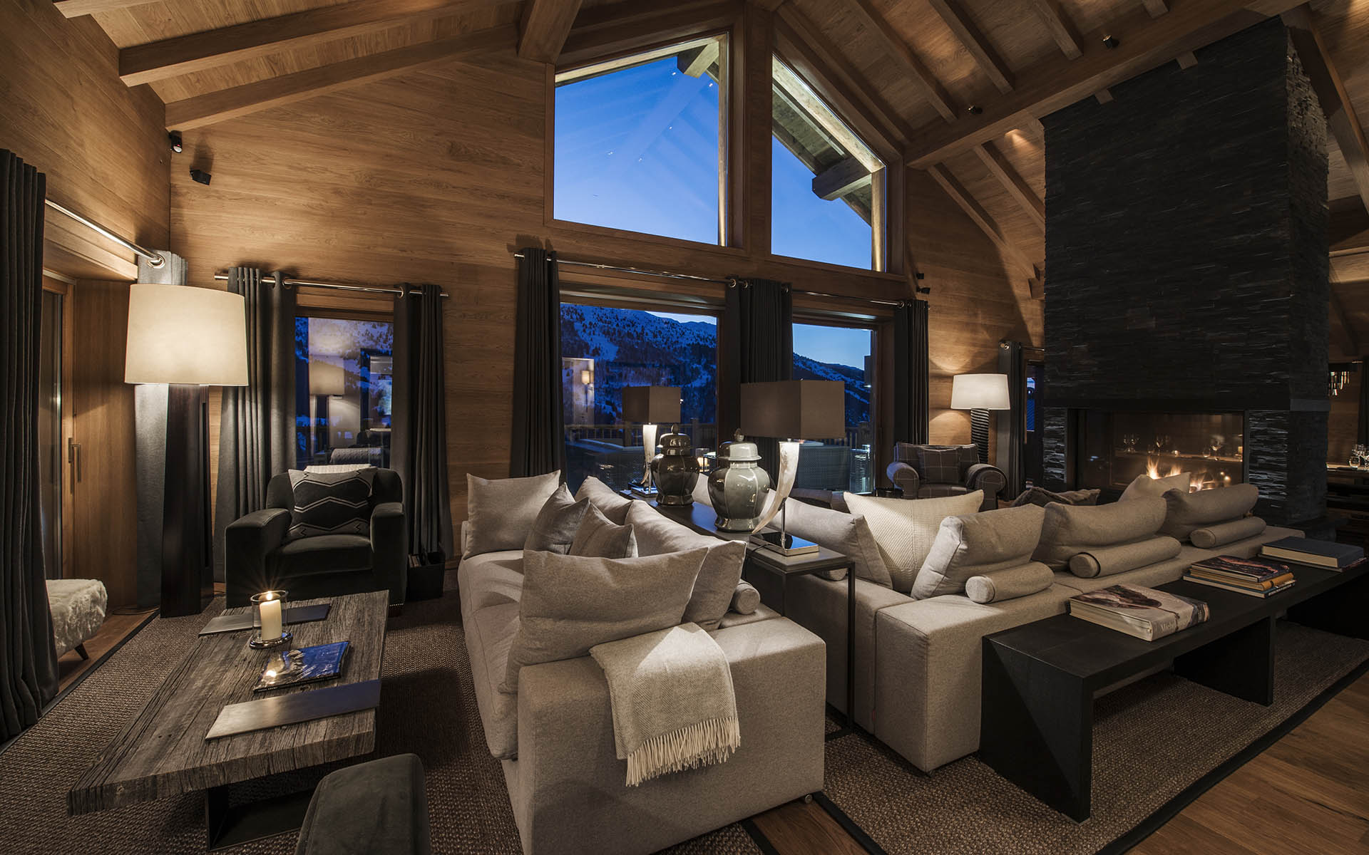 The huge, vaulted-roofed living room has floor-to-ceiling windows giving you wonderful views out to the slopes. Two distinct seating areas, made up of squashy sofas around large coffee tables means there is plenty of space for your whole party to lounge and enjoy afternoon tea when you all trudge in from the slopes. An imposing fireplace makes this a really cosy spot to hunker down and look out on the snow.