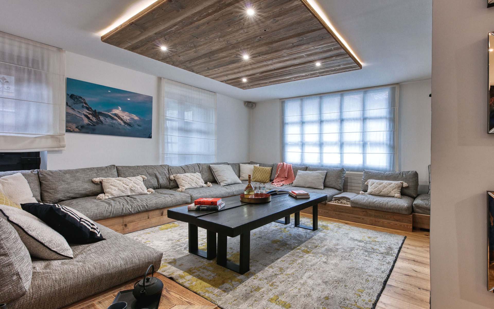 At the heart of Chalet Le Marti, Chamonix, is a laid-back living space with a huge seating area extending round the whole of the sitting room, close to the roaring fireplace, with logs ready to burn piled high beside it. It’s the ideal spot in which to curl up with a book or catch up with friends over a few drinks and hear all the best bits of their skiing day. Just the other side of the fireplace is the contemporary dining area, beautifully lit and designed for long, leisurely meals, cooked by your chef.