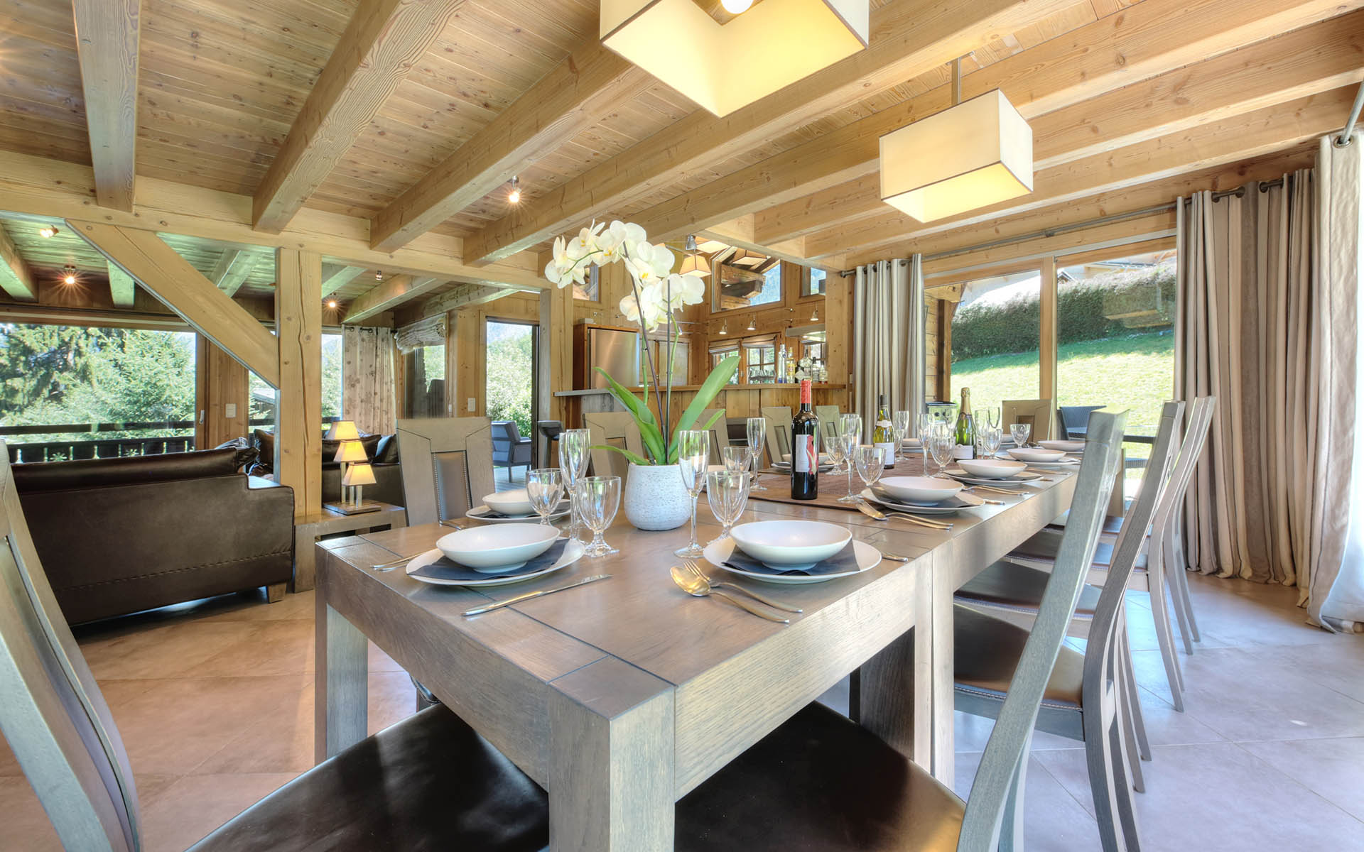 At the heart of this luxury chalet is the light and airy but supremely cosy living and dining area, with blazing wood fire, an intimate dining area, and doors that lead out to the garden and the sunken hot tub on the terrace. It’s a fabulous entertaining space, ideal for a party for a special occasion or simply sprawling together on the capacious sofas at the end of an energetic skiing day. The kitchen and bar are open-plan to the area, making this a really sociable space.