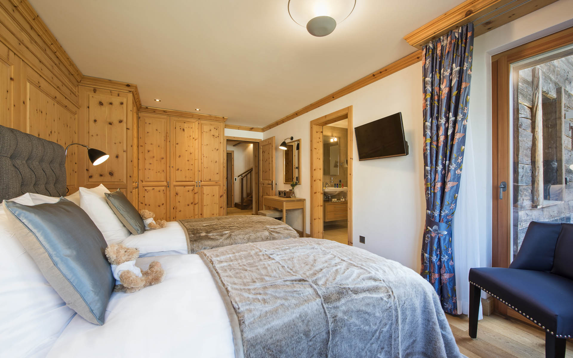 Master bedrooms on first floor with double/twin beds, en-suite bathrooms, TVs and balconies with Matterhorn views.