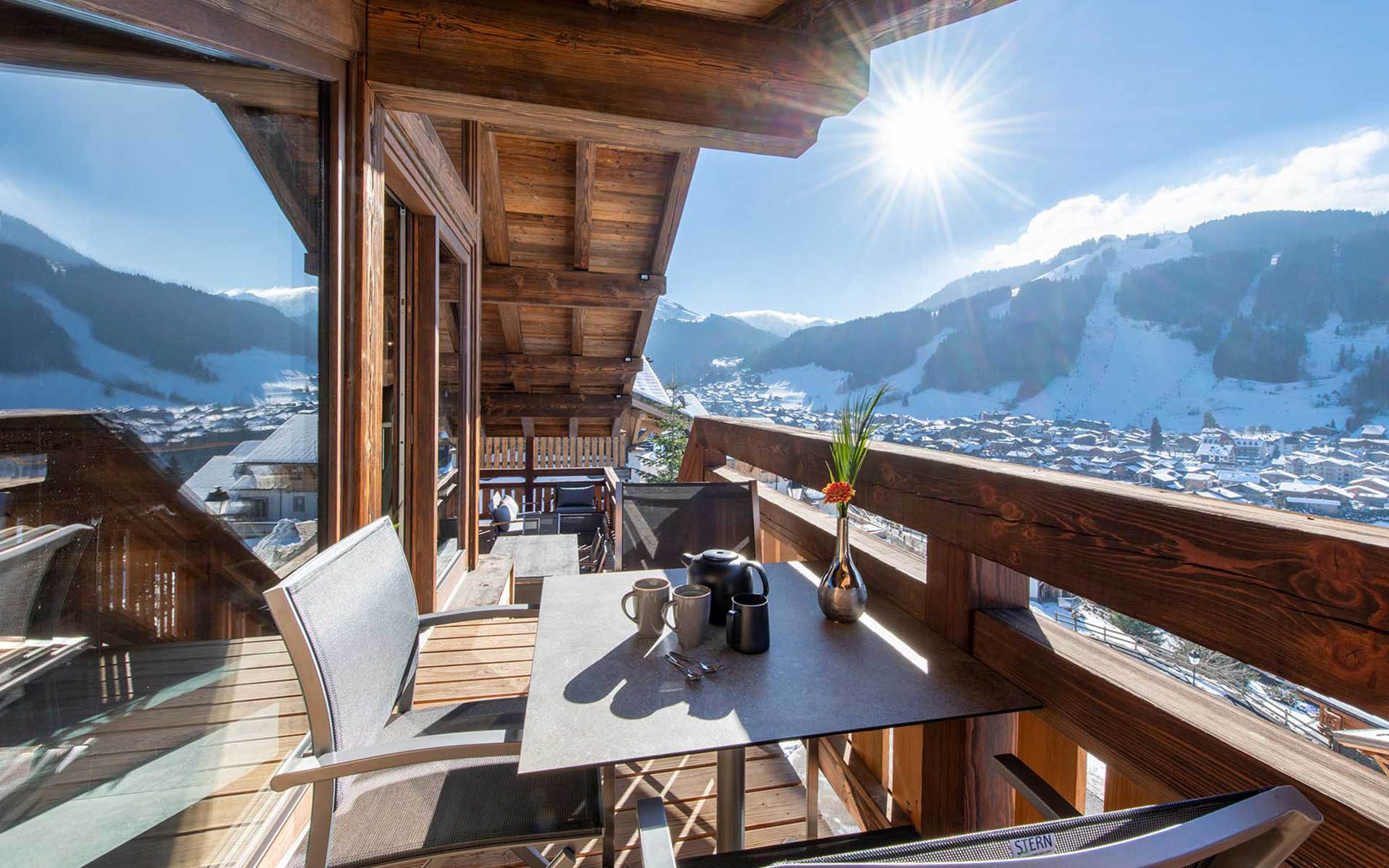 Upstairs, things get even more special. A very generous open-plan kitchen and dining area leads down a few steps to the impeccably styled living room with its huge picture windows. From both areas there is access to the large balcony, which wraps around the entire front and side of the chalet to make the most of uninterrupted views of the snowy peaks. As well as comfortable outdoor furniture you’ll find a hot tub nestled in the eaves at the far end of the balcony, so you can soak and enjoy the views under shelter.