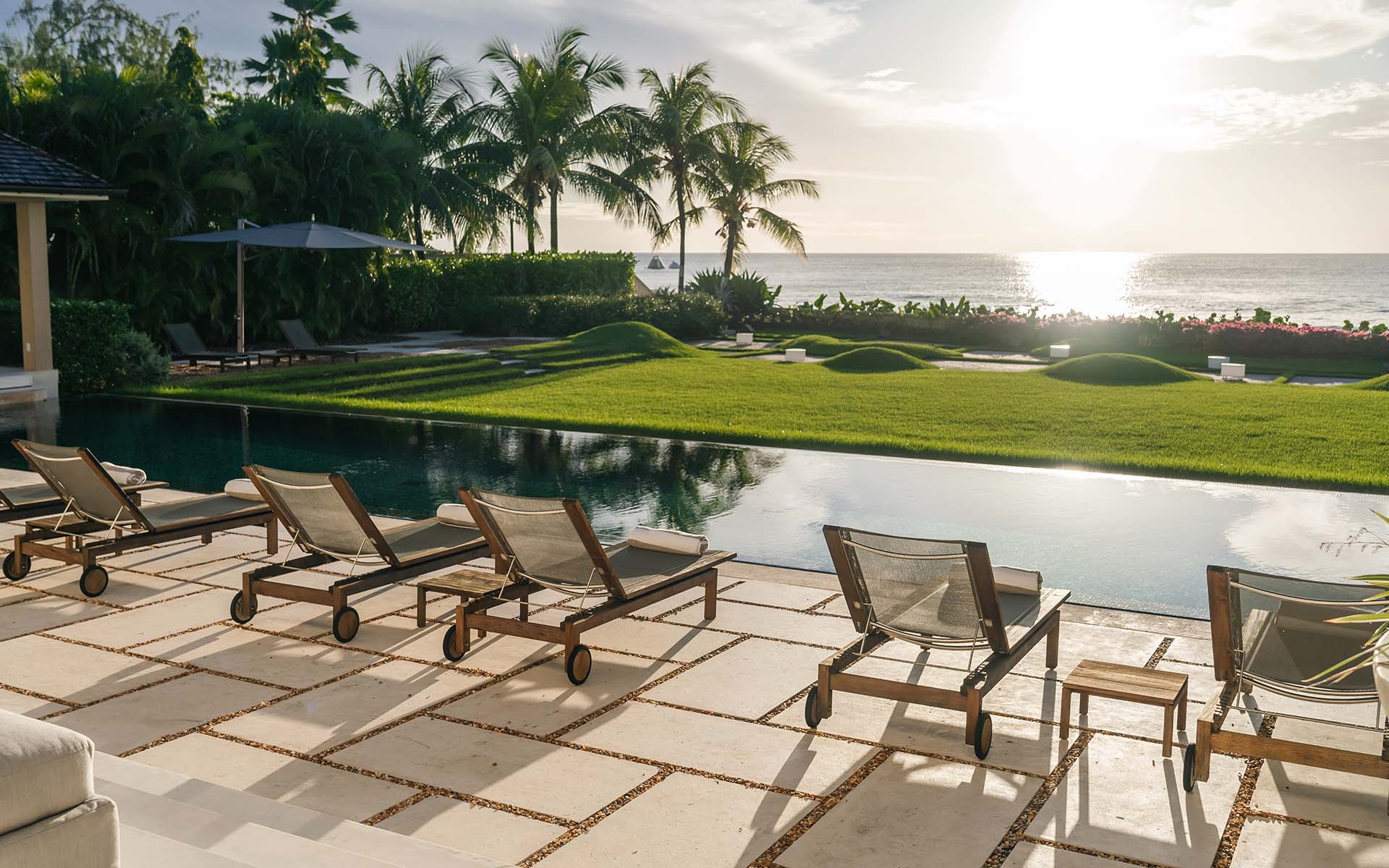 In the huge living room neutral shades and a cool limestone floor provide a calming backdrop for coastal-themed artwork and furnishings, from a feature wall depicting local coral to driftwood-style lamp bases and coffee tables. Comfy designer sofas are large enough to encourage ocean-view lounging and provide a space to gather with friends and catch up in the cool of the house on hot days. A beautiful Whetstone Oak dining table is the setting for delicious meals whipped up in the contemporary kitchen, where either you or your private chef can make the most of the top-of-the-range gadgetry. As well as the main living and entertaining spaces, Godings Beach House also has its own private cinema, gym and study, so there’s always somewhere to find a little peace and quiet if you need it.