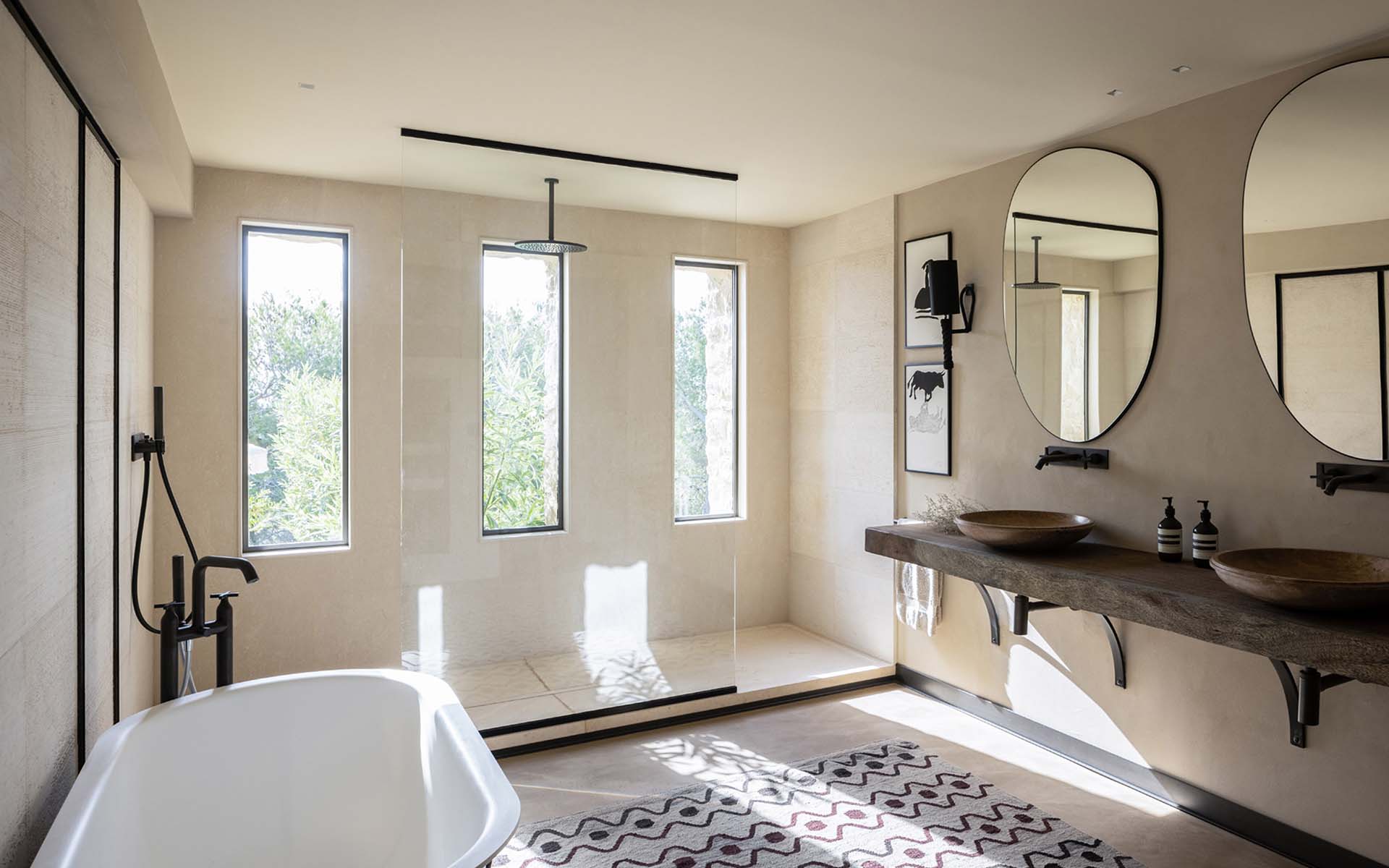 Outside, things are equally impressive. The villa’s hilltop location brings breath-taking views over the lush Parc des Alpilles – you can expect unforgettable sunrises and sunsets here. A stunning infinity swimming pool appears to float above the treetops, while the large sun-drenched terrace is the perfect spot for lavish breakfast spreads. Gloriously fragrant gardens of lavender, rosemary and olive trees invite guests to slow down and breathe in the good life.
