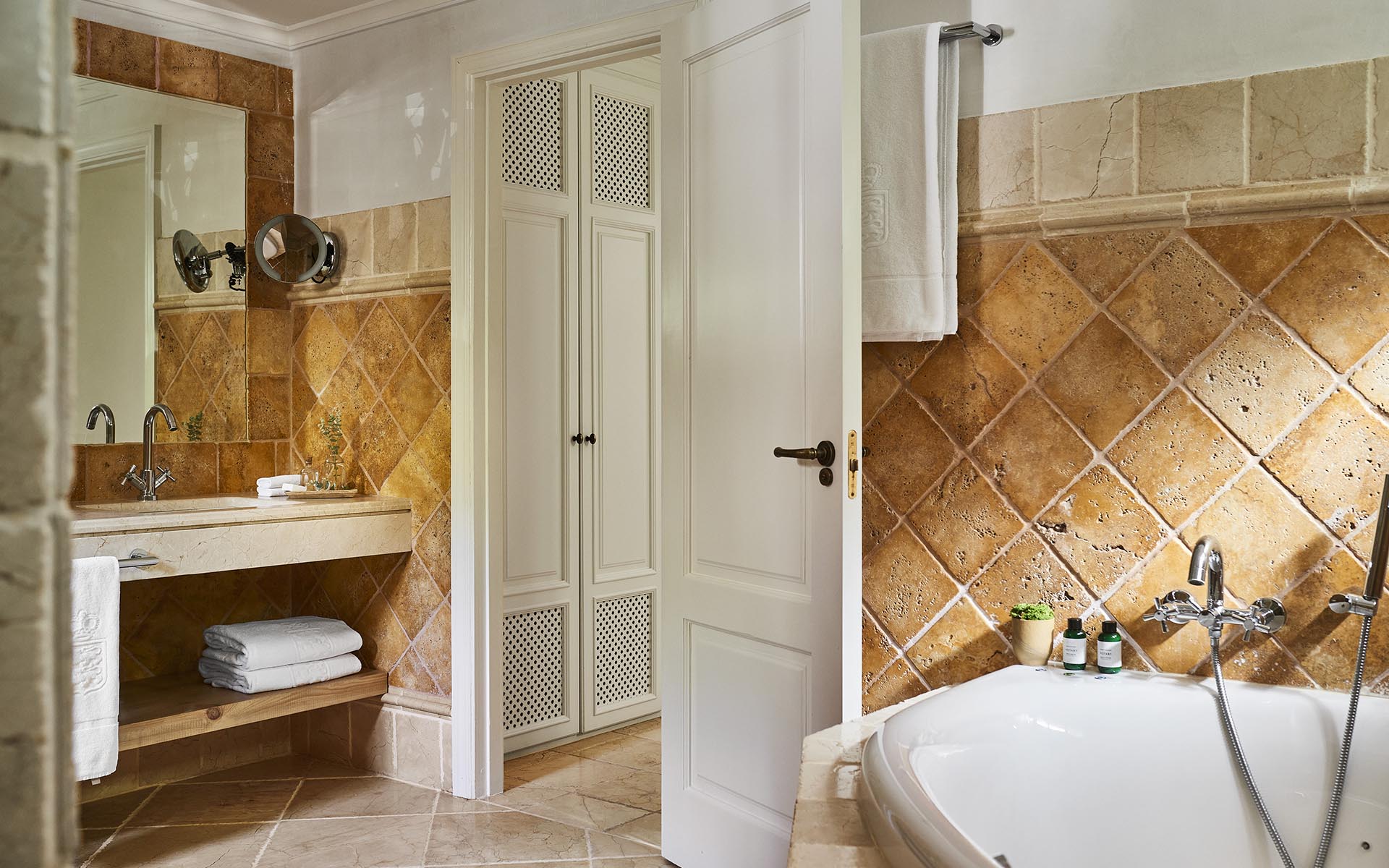 One of the bedrooms is a double bedroom with king-sized bed and the second can be a double or twin bedroom. Each has an Iranian marble en-suite bathroom with hydromassage bath, separate shower and double basins.