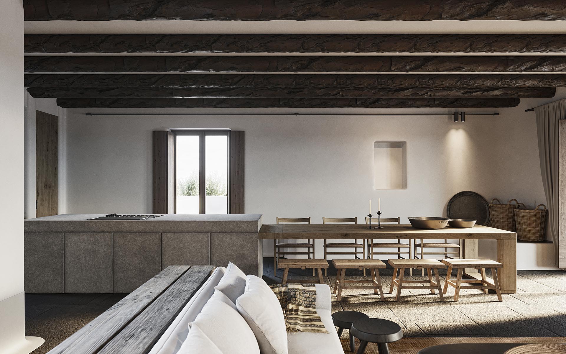 Inside, the juxtaposition of traditional and contemporary is clearly and beautifully executed. In the main living space, stone floors and exposed wooden beams contrast the modern concrete kitchen and stylish cream sofas, while in the bedrooms, a soft, bohemian feel is achieved through rattan furniture, plush white bedding and a neutral colour scheme.