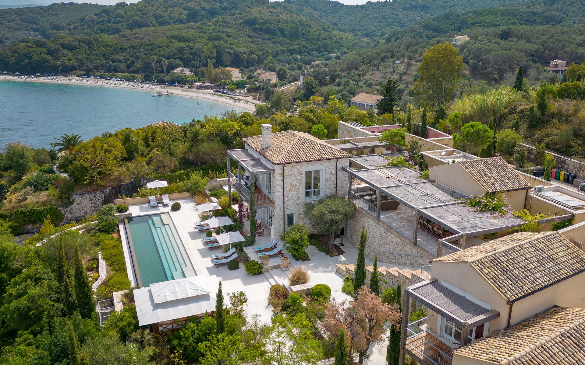In the five bedrooms, unique touches range from indoor gardens to platform beds, while the kitchen is kitted out with smart appliances fit for a professional chef. Outside, a green-roofed house (the fifth bedroom) hidden away in the gardens, is the perfect couple’s hideaway. A series of outdoor terraces offer private spaces to curl up and relax with a good book and sociable spots where everyone can come together for drinks and games. In this quieter part of Corfu, be sure to head out to the pool-lit terrace after dark to gaze up at the starry night sky.