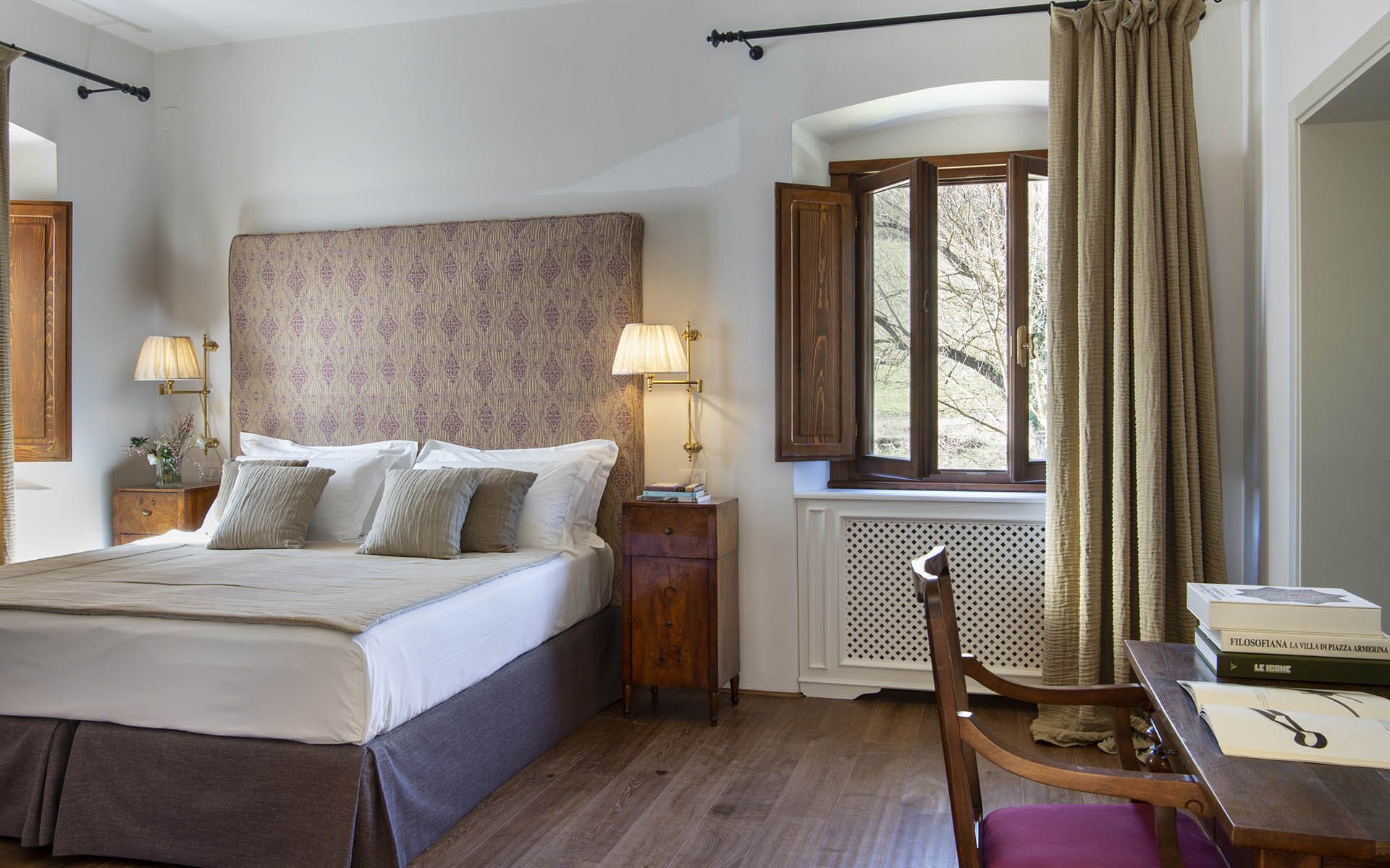 This luxury villa in Tuscany is set amid softly undulating hills and ancient forests and meadows, where you can sometimes spot deer and hares darting about the countryside. The lawned garden and outdoor living and dining areas mean you can live an extremely al fresco life here. On one side of the house is an infinity-edged swimming pool, with shaded loungers, where you can while away lazy afternoons, enjoying the scenery.