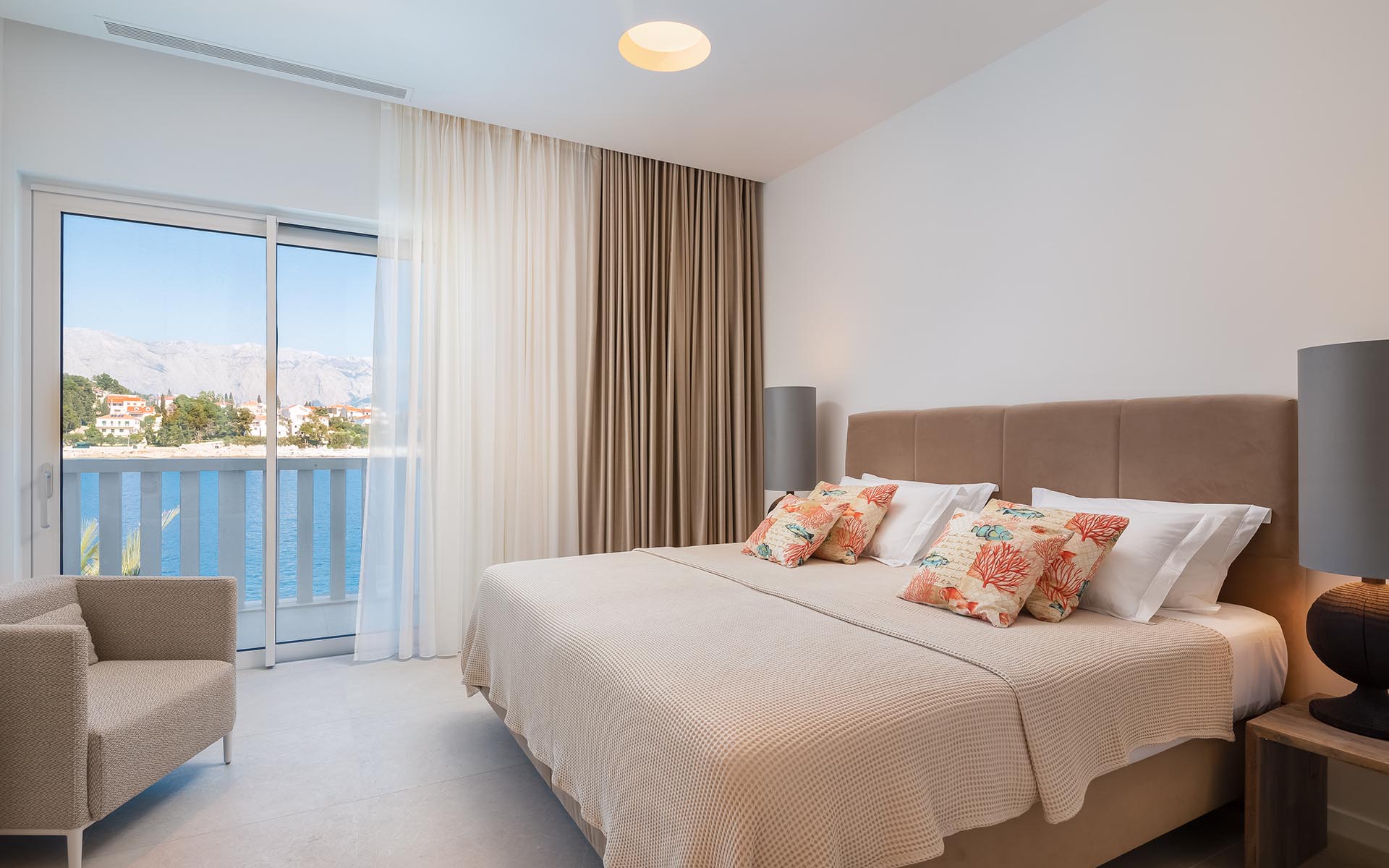 Double/twin bedroom with king-sized bed, en-suite bathroom and access to shared, sea view balcony