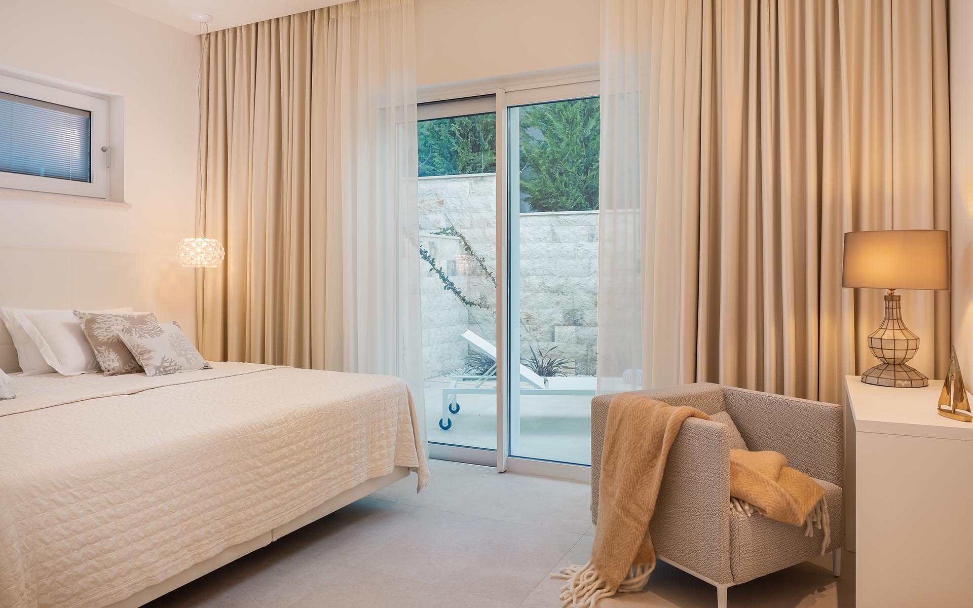 Perched on the edge of the sea in a charming fishing village, the steps from this luxury villa appear to tumble down into the waves. Villa More welcomes you from the moment you step out of the car. Inside the contemporary property, every last detail has been considered. White sofas and chairs in the cosy living space sit alongside rustic wood accessories for a laid-back coastal feel. Nearby is a dining room with statement lighting, close enough to the top-of-the-range kitchen and wine cellar to be extremely sociable. And the living spaces all have stunning views out over the sea and the mountains beyond on the mainland.