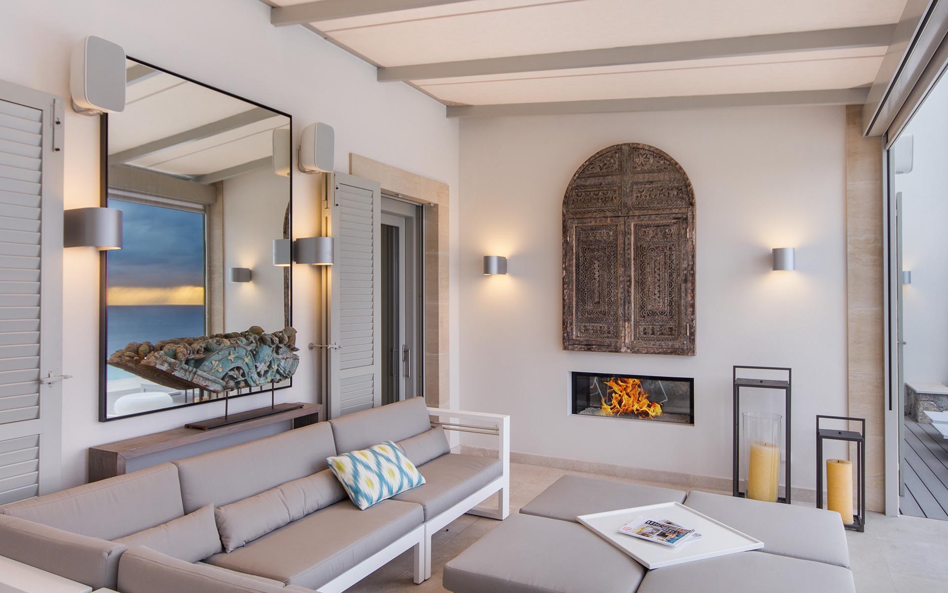 Ocaso translates as ‘sunset’, and the villa lives up to its namesakes with spectacular end of the day displays from mother nature, 365 days a year. Built around an ancient olive tree and graced with beautiful bougainvillea, native poplars and swaying palm trees, the setting is perfect for a sundowner with distant views out to Isla de Sa Dragonera, which as the names suggests, resembles a dragon peering out of the shimmering waters. A striking natural feature to watch the sun dip behind.