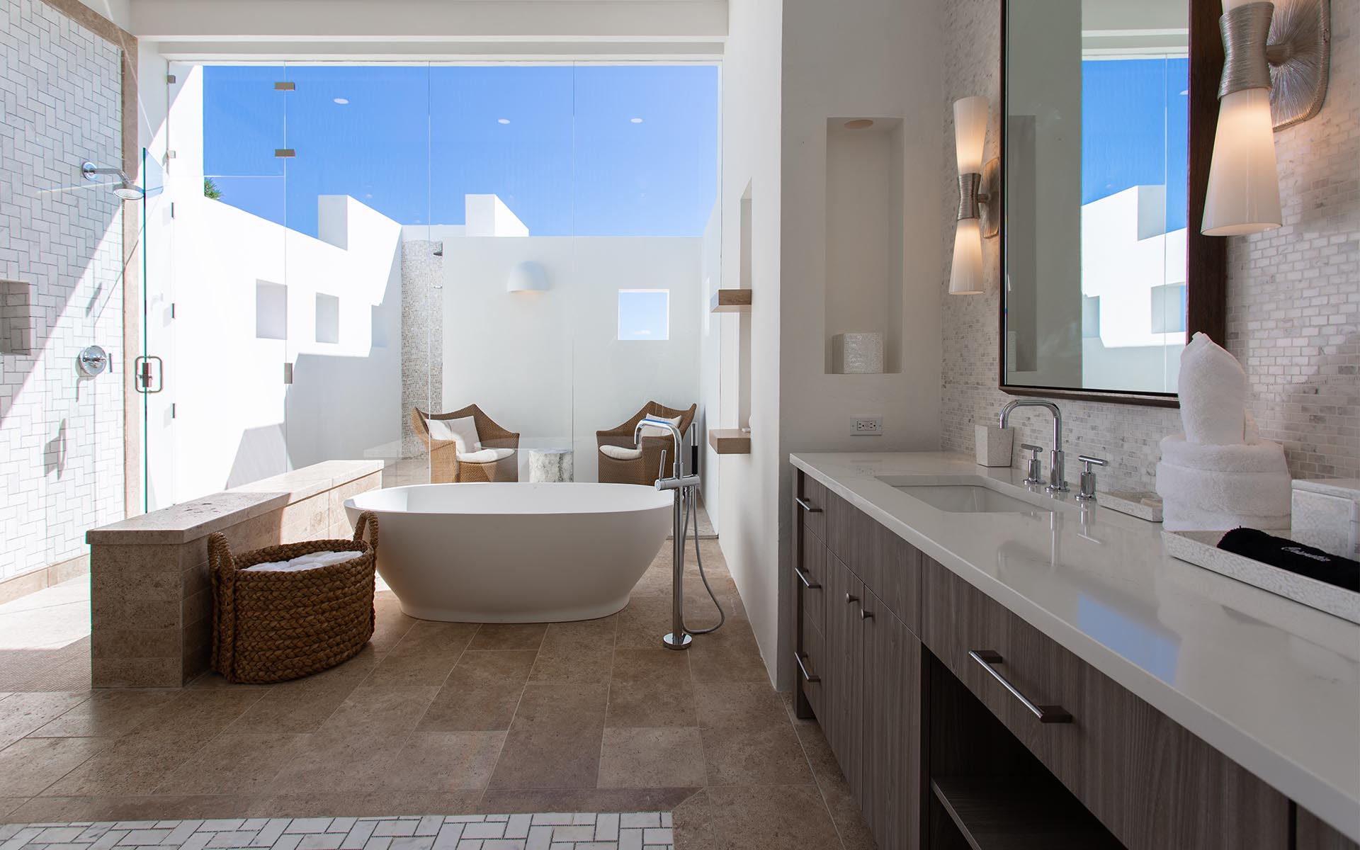 Master suite on second floor with king bed, terrace with sea view, outdoor shower and en-suite marble bathroom.