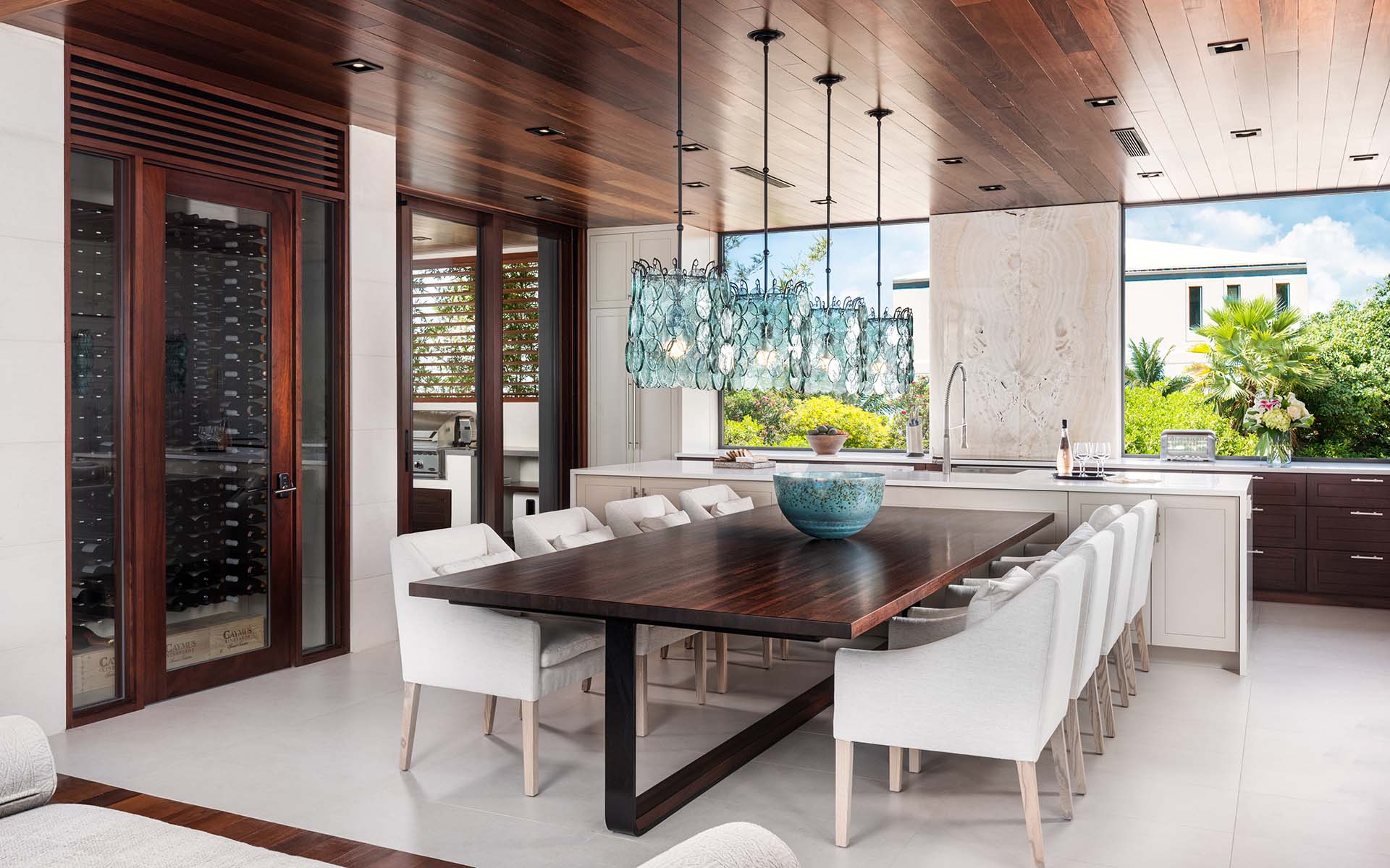 The covered outdoor bar and dining area, is a wonderful spot to eat as a group, sheltered from the heat of the day, and even the odd rainstorm. But a dining table can be easily set up on the beach deck to allow you to eat right on the sand. Indoors, a large, sociable dining area with bar area and kitchen allows you to chat over a glass of wine while your chef creates your meal in the prep kitchen nearby.